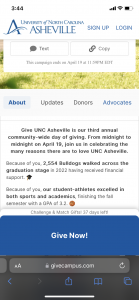 Use your network. Reach out to fellow alumni, friends, and UNC Asheville fans. People can’t donate if they don’t know to donate!
